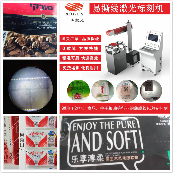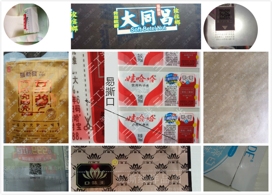 在一次防偽膜上加上易撕線的作用是用于產(chǎn)品的拆封,更便于產(chǎn)品的防偽。一次性防偽膜只要撕開就不能再粘連上,在桶裝水、純凈水的包裝上具有很強(qiáng)的防偽效果,而一次性防偽膜上的易撕線更是加強(qiáng)了易撕防偽的效果。易撕線激光打標(biāo)機(jī)很好的解決了傳統(tǒng)的遺留問題,因?yàn)槠浼庸ば矢?、加工品質(zhì)好的特性,使得激光加工成為了PE、PVC、PET薄膜加工行業(yè)新的工藝標(biāo)準(zhǔn)。武漢三工激光針對(duì)薄膜包裝行業(yè)提出激光代替機(jī)械加工工藝的企業(yè),專為薄膜易撕線、定量透氣孔設(shè)計(jì),打標(biāo)速度快,設(shè)備易操作,性能穩(wěn)定,使用壽命長等。